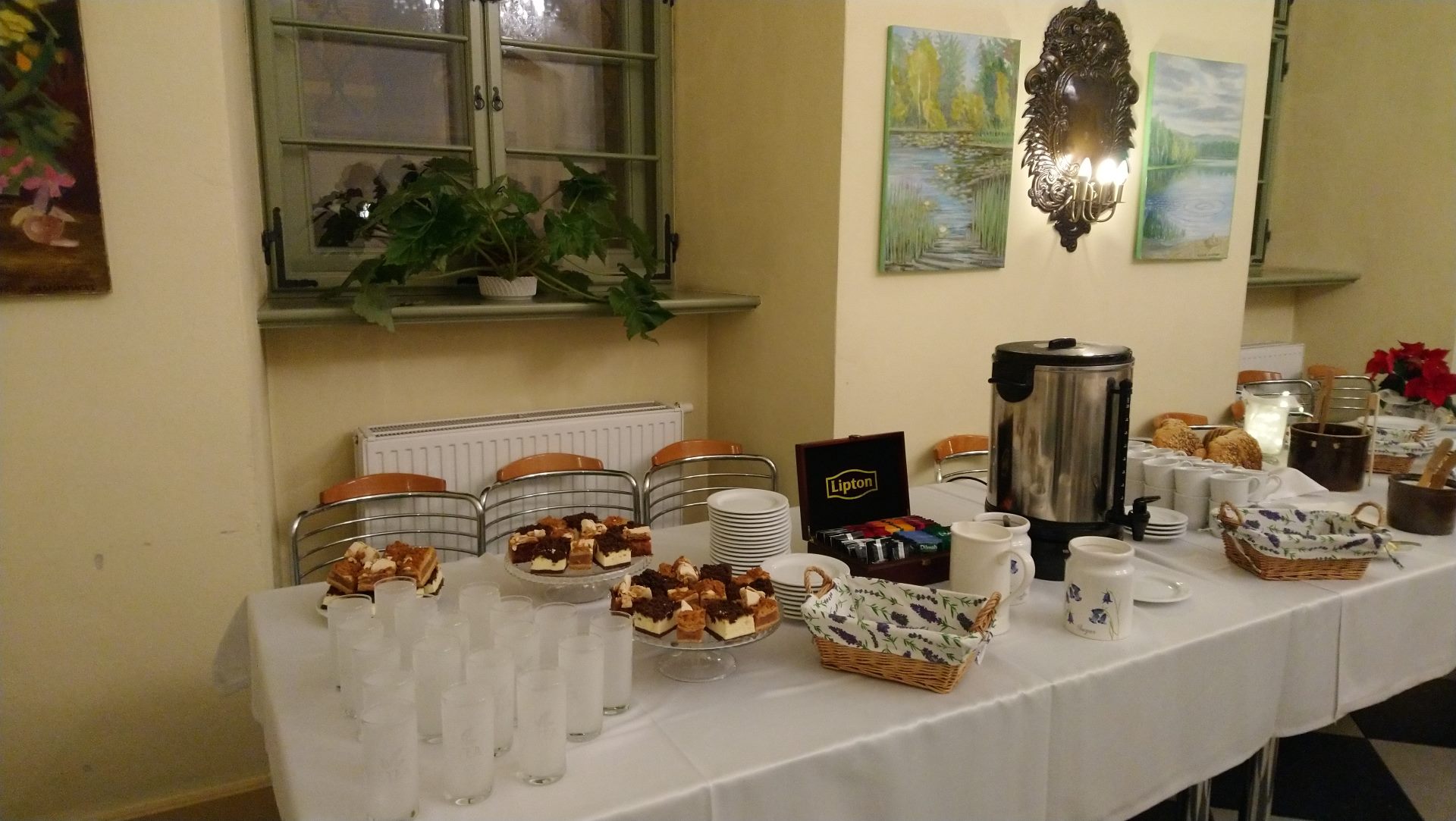 Proponujemy skorzystanie z usługi cateringowej. Na miejscu dostępny jest ekspres kawowy oraz warniki.